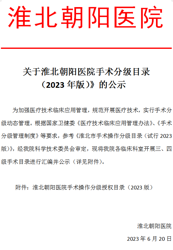 為加強醫(yī)療技術臨床應用管理,規(guī)范開展醫(yī)療技術,實行手術分級動態(tài)管理。根據(jù)國家衛(wèi)健委《醫(yī)療技術臨床應用管理辦法》、《手術分級管理制度》等要求,參考《淮北市手術操作分級目錄(試行2023版)》,經(jīng)我院科學技術委員會審定,現(xiàn)將我院各臨床科室開展三、四級手術目錄進行匯編并公示(詳見附件)。